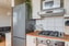 Praktiskt och välplanerat kök med bra arbetsytor och plats för matbord. Utrustat med ugn, gashäll, fläkt, mikrovågsugn samt kyl/frys. Vita skåpsluckor, stänkskydd i vitt och bänkskiva i trä. Golvet är belagt i samma laminatgolv som vardagsrummet och väggarna är målade i grönt.