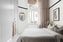 Ljust och rymligt sovrum med gråmålat brädgolv, vita väggar med listverk och platsbyggda garderober i grått längs ena väggen. Fint ljusinsläpp från ett högt fönsterparti med djupa fönsternischer.