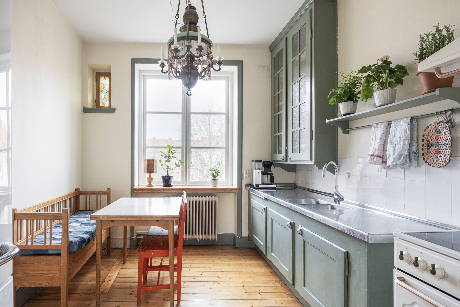 Kök - Charmigt kök med bevarade originaldetaljer i form av gröna, målade luckor och klassiskt vitt kakel ovan arbetsytorna. Här finns matplats för upp till 6 personer vid fönster med fint ljusinsläpp. Köket är utrustat med spis, ugn, kyl, frys och fläkt.