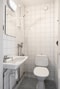 Badrum - Badrum med klinkergolv och helkaklade väggar i ljusa toner. Utrustat med WC, handfat och dusch.