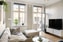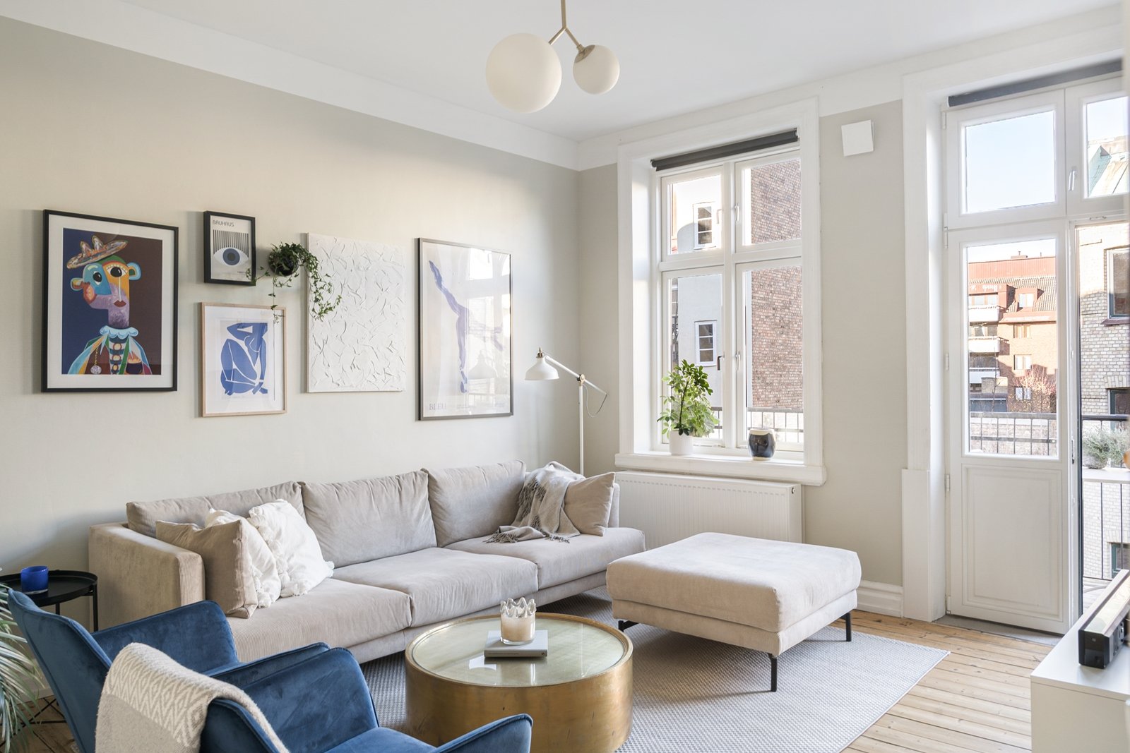 Vardagsrummet fortsätter i samma harmoniska stil med sandfärgade, släta väggar och vackert trägolv. Här finns gott om utrymme för både soffgrupp och fåtöljer, och från rummet når du den stora balkongen – en riktig oas mot innergården och takåsarna. Ett rum att leva i, umgås i och verkligen trivas i.