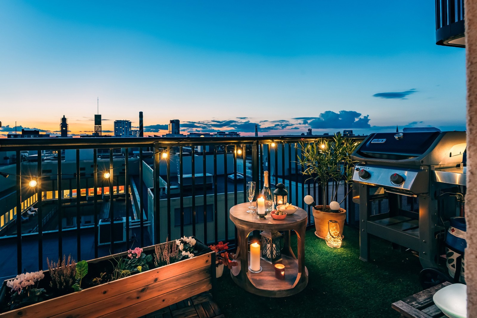 Högst upp i fastigheten finns en stor takterrass med planteringar, sittbänkar, gemensam grill och belysning. Här får du en fenomenal utsikt över Malmö med kända landmärken. Den gemensamma grillen bokar man vid användning.