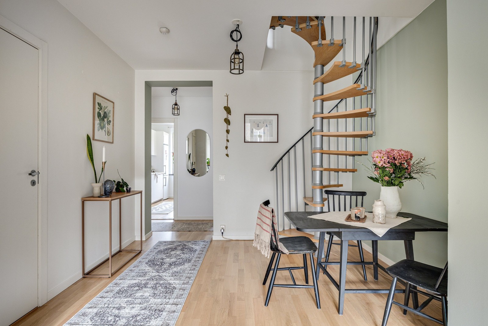 Via trappan från entréplan eller egen ingång från trapphus nås plan två. Här finns ytterligare rum med flexibilitet, perfekt för kontor, sovrum eller extra sällskapsyta. Väggarna är vitmålade och på golvet ligger ett ljust parkettgolv som skapar en enhetlig och modern känsla genom hela våningen.