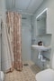 Modernt och totalrenoverat badrum från 2018 i ett tidlöst utförande med vitt kakel och grått klinkergolv. Badrummet är försett med vask, spegel, duschhörna med vikbara duschväggar, WC och handdukstork. Golvvärme.
