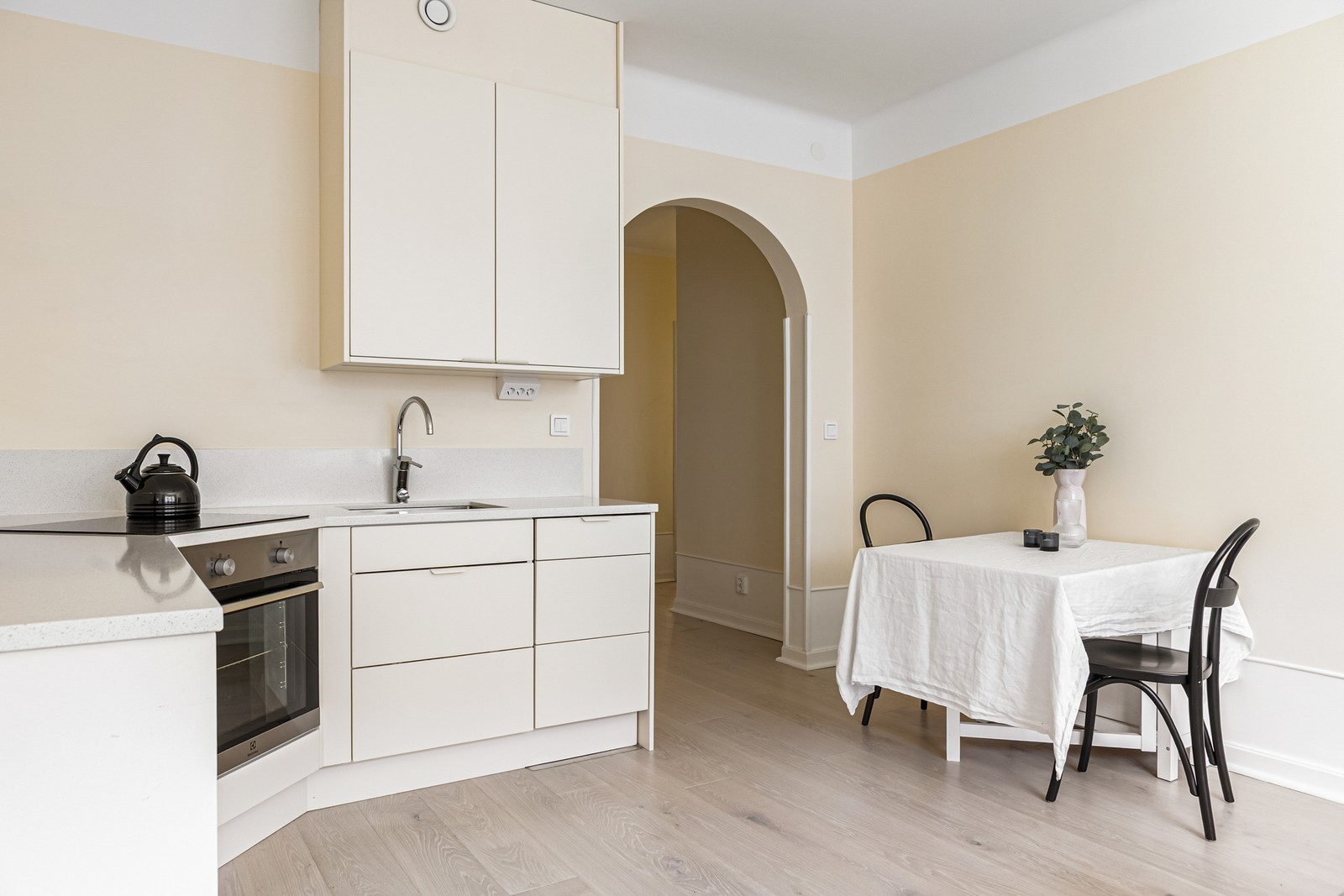 Hela lägenheten är målad i en beige/gul ton som skapar ett harmoniskt och stilrent intryck. Samtidigt har 30-talscharmen varsamt bevarats genom detaljer som valvet in till vardagsrummet, takets stuckatur och den vackra glasdörren i sovrummet. Bostaden är dessutom både praktisk och funktionell med en kombinerad tvätt- och torktumlare som diskret byggts in i garderoben.