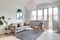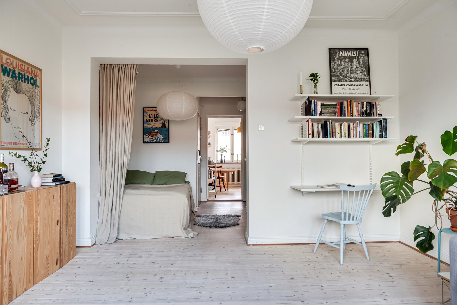 I bostadens mitt ligger halvan som passar perfekt som sängplats eller hemmakontor. Den öppna planlösningen mot vardagsrummet skapar en rymlig umgängesyta med plats för soffa, soffbord och mediamöbel. Används halvan som sovdel rymmer vardagsrummet fortfarande arbetsbord eller matbord. Stora fönsterpartier och en fransk balkong ger rummet fint ljus och utsikt över torget. De vitmålade väggarna, eleganta stuckaturdetaljer och det vitlaserade brädgolvet förstärker den ljusa, luftiga känslan som takhöjden bidrar till.