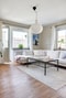 Generöst och socialt vardagsrum med härligt ljusinsläpp från två väderstreck. Härifrån nås den mysiga balkongen – en perfekt plats för eftermiddagskaffet. Rummet erbjuder gott om plats för både matgrupp och en större soffhörna. Samma parkettgolv som i hallen och beiga väggar skapar en stilren och inbjudande atmosfär.