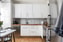 Stilrent och trivsamt kök med vita luckor och väggar målade i en lugn, ljusgrön ton. På golvet ligger parkett och arbetsytorna pryds av en träbänkskiva med klassiskt grått kakel som stänkskydd. Här finns plats för ett mindre matbord för upp till fyra personer – perfekt för vardagens måltider. Köket är fullt utrustat med spishäll och ugn (Smeg), kyl och frys (Bosch), fläkt samt diskmaskin (Smeg).