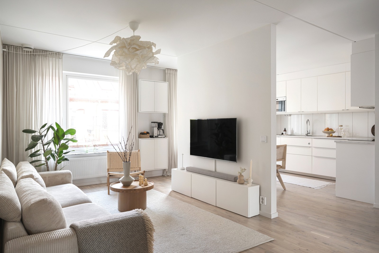 Vidare genom den öppna planlösningen bjuder vardagsrummet på en lugn och elegant atmosfär, med vita väggar och en kalkfärgad fondvägg som sätter tonen med sin mjuka naturliga textur. Här finns plats för en loungegrupp som inbjuder till socialt umgänge, en perfekt balans mellan vardagslyx och hemtrevnad.