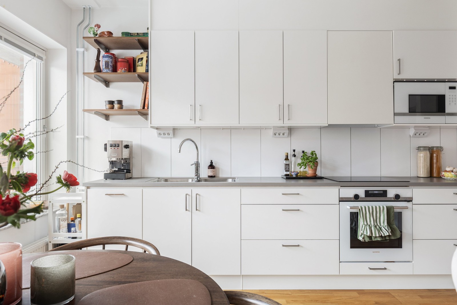 Den maskinella utrustningen är genomgående från Siemens och består av induktionshäll, varmluftsugn, mikro, kyl/frys samt diskmaskin – en kvalitativ och komplett utrustning som förenklar vardagen.