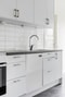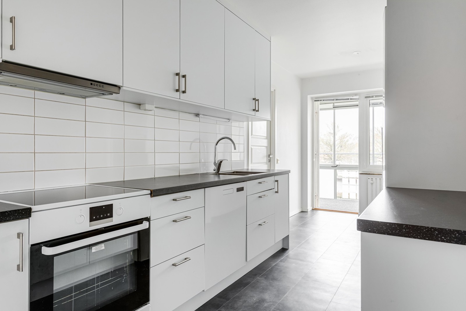 Det mörka golvet från hallen fortsätter in i köket och skapar en enhetlig känsla. Vita väggar, vita skåpsluckor och mörk bänkskiva tillsammans med vitt kaklat stänkskydd ger en modern kontrast. Här finns plats för matbord för 2–4 personer samt direkt access till den inglasade balkongen. Köket är utrustat med kyl och frys, spis, ugn, fläkt, diskmaskin och vask.