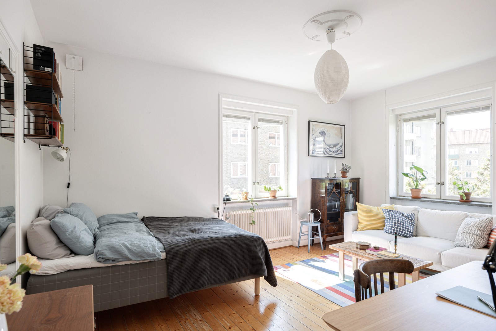 I vardagsrummet flödar ljuset in genom fönster i två väderstreck och här finns plats för soffgrupp matsalsbord och säng.