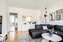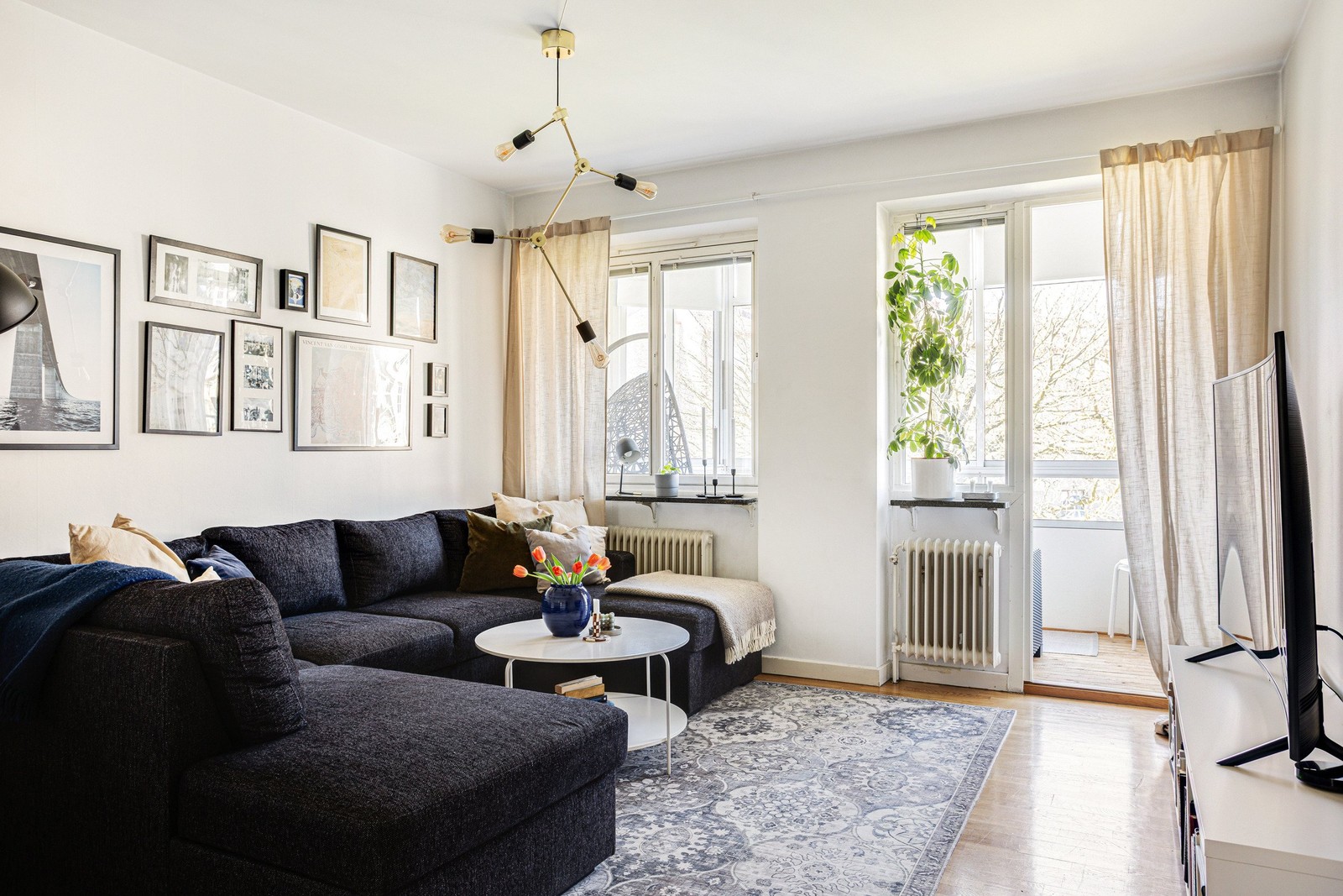 Rymligt och ljust vardagsrum med utgång till balkongen där du kan njuta av solen stor del av dagen och kvällen. Parkettgolv och vitmålade väggar.