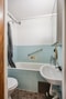 Badrum : Halvkaklat badrum med inkaklat badkar, WC och handfat.