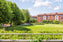 Innergård med lekplats, murade grillar, flera sittgrupper och grönytor. Lekplatsen har gungor, lekställning, rutschkana och sandlåda.