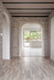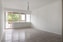 Luftigt vardagsrum med vita väggar och ljust laminatgolv. Plats för soffa och matbord. Härifrån når vi även balkongen.