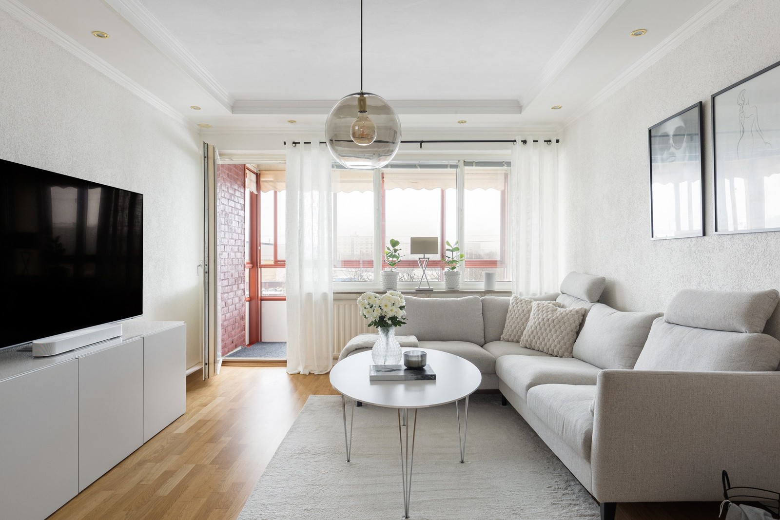 Stort och rymligt med trägolv och vita väggar. Gott om plats för större soffgrupp samt möjlighet till matplats.