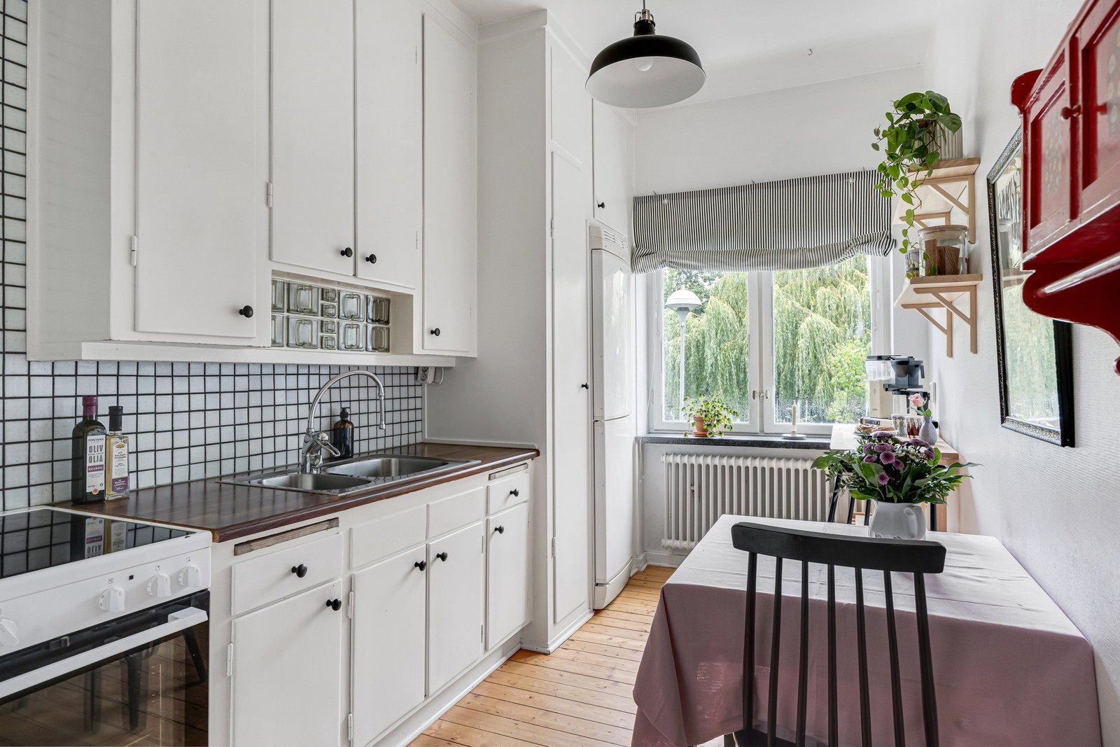 Genomgående tvåa på grönskande läge med originalkök och fint renoverat badrum.