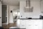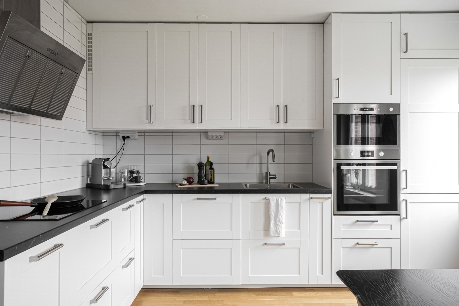 Stor och socialt kök där det finns plats för ett större matbord för många gäster. Köket från IKEA renoverades 2022 och har stilrena vita luckor, vitt kakel och mörk bänkskiva i laminat. Vitvaror enligt följande: kyl/frys, spis, ugn, diskmaskin, fläkt och mikro, samtliga från Elektrolux 2022.