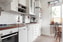 Ljust och trevligt kök med vit inredning, bänkskiva i trä. Utrustat med spis, ugn, fläkt, vask, kyl/frys samt diskmaskin. Plats för matbord för 3-4 personer. Brädgolv, ljust målade väggar.
