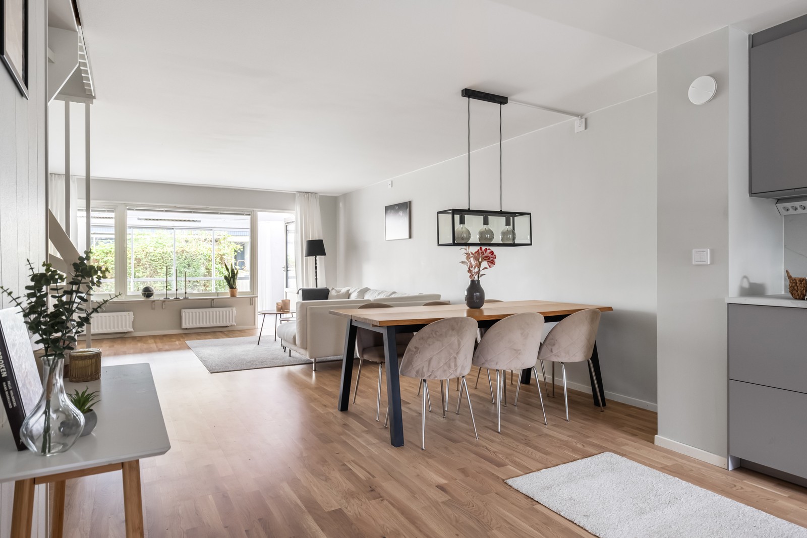 Parkett på golv och ljusgrå väggar. Ger plats för soffgrupp samt matsalsmöblemang mellan vardagsrum och kök. Från vardagsrummet nås det inglasade uterummet som tar oss vidare till trädgården.