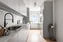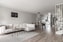 Klinker som övergår i parkett på golv och ljusgrå väggar.