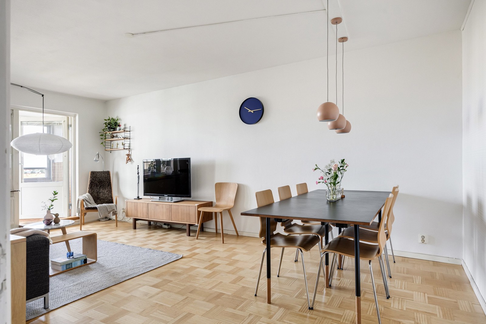Rymligt vardagsrum med plats för soffgrupp samt matsalsbord. Här ligger originalparkettgolv och väggarna går i vitt. Från vardagsrummet nås den stora balkongen i västerläge med plats för sittgrupp. Här är det fantastisk utsikt mot såväl Öresundsbron, Ribersborg samt Turning Torso.