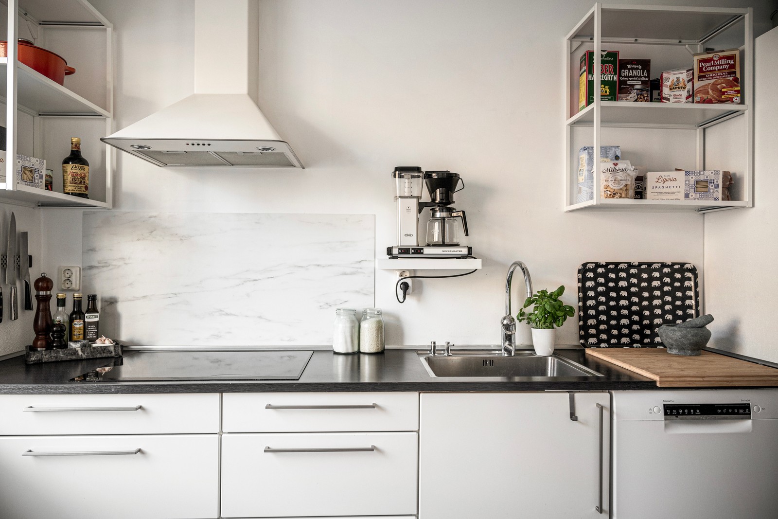 Via hallen når vi köket. Modernt kök med släta luckor i vitt och mörka arbetsytor. Bra arbetsytor erbjuds i köket. Kökets maskinella utrustning består av: kombinerad kyl & frys, induktionshäll (2025), fläkt, inbyggd mikrovågsugn och inbyggd ugn. På golvet ligger ett laminatgolv och väggarna är vita. Härligt ljusbringande fönsterparti med plats för matbord intill.