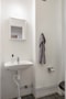 Även hemmets gäst-wc finns placerat i hallen och förser oss med grå klinker på golv i kombination med vitmålade väggar. Detta är utrustat med handfat med spegelskåp ovan och wc.