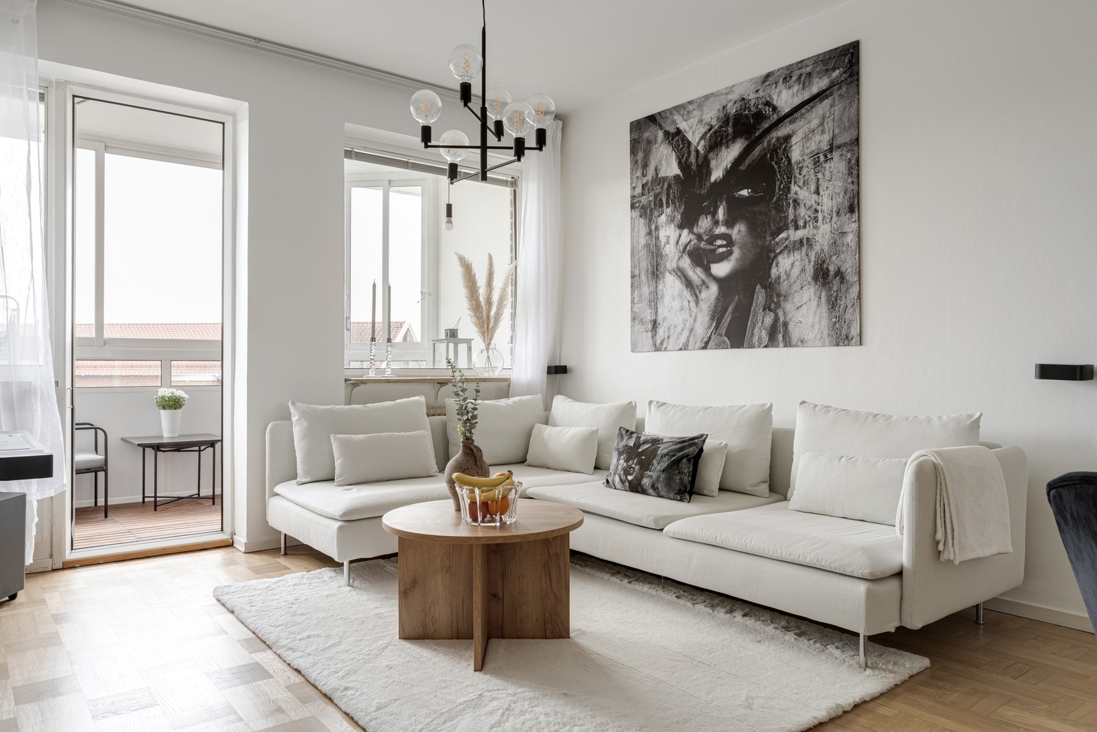 Rymligt vardagsrum med vackert bevarad parkett och vita väggar. Här finns gott om plats för både soffgrupp och matbord. Utgång till en fin inglasad balkong som förlänger säsongen.