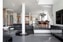 Våningens öppna matsalsdel ligger som på en platå över de nedre sällskapsytorna och intill ett stort, diagonalt glasparti. Det balanseras av den vita, kraftfulla innerväggen och matsalsdelen lyfts fram av ett ljusare stengolv. Här ryms långbord för allt från familjens högtider och stora middagar, till tisdagskvällen pastarätter och vardagliga samtal.