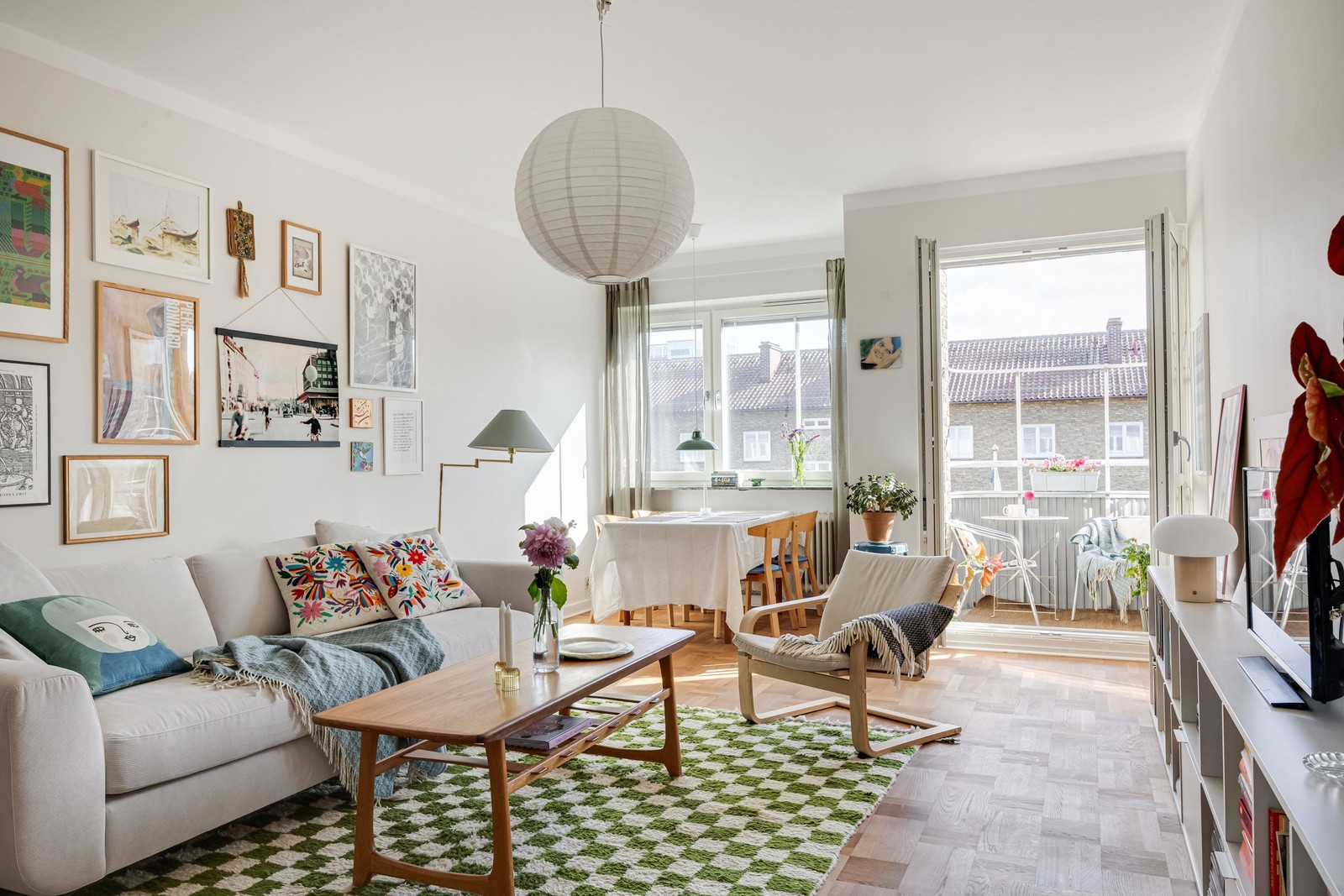 Vardagsrummet har ett magnifikt ljusflöde som skapar en inbjudande atmosfär och gott om plats för både möblemang och en större matplats. Den anslutande balkongen i söderläge bjuder på utsikt över den grönskande innergården och blir snabbt en favoritplats med sol från tidig vår till sen höst. Här bor du med ett funktionellt och välrenoverat kök med gott om förvaring, plats för ett mindre matbord och alla moderna bekvämligheter du behöver, som spis, ugn, diskmaskin och kyl & frys.