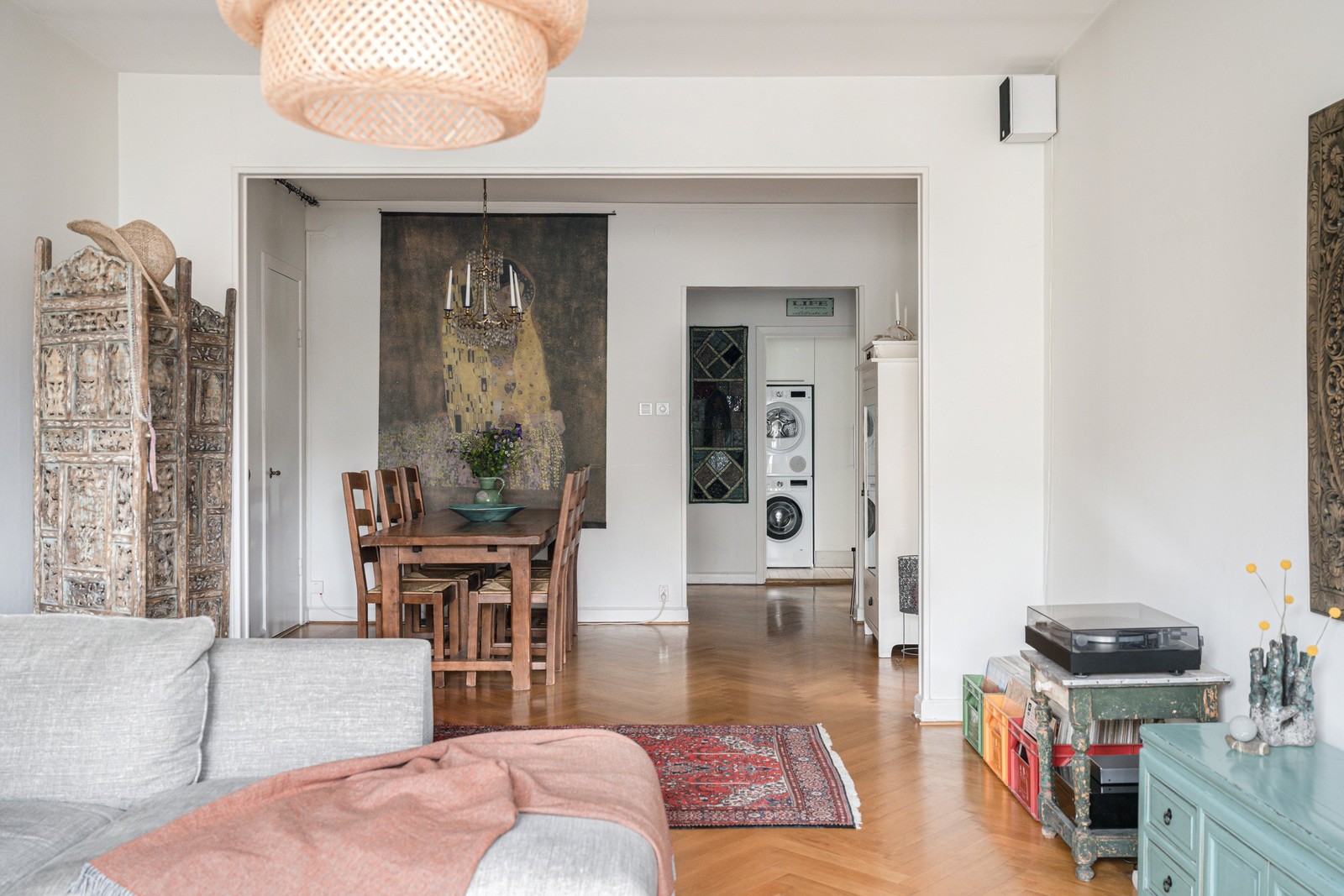 Två rymliga sovrum ger gott om utrymme för hela familjen, och för den som önskar finns möjlighet att skapa ett tredje. Genom större delen av lägenheten löper vacker fiskbensparkett, medan köket pryds av ett stilrent trägolv. Tillsammans med de noggrant utvalda kulörerna skapas ett hem med varm och personlig karaktär.