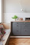 Hallen bjuder in med parkettgolv och ljusgrå väggar och medaljongtapet i tak. Här finns både badrum och gästwc. Badrummet är helkaklat i vitt och mörkblått med tak och väggbelysning från Byggfabriken. Vattenburen handdukstork, vaskskåp målat med mörkgrå linoljefärg och platsbyggd ekhylla.