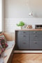 Köket från 2015 är ett riktigt drömkök med platsbyggd inredning från IKEA,, målad med grå linoljefärg , rostfria beslag från Byggfabriken.och massiv bänkskiva av ek med vit liggande kakel ovanför. Vägghängda taklampor från Örsjö PJ50 ingår i köpet. Kyl, frys, ugn (2018), spishäll, spisfläkt och diskmaskin.
