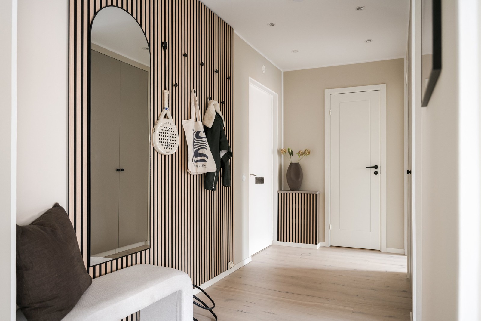 Välkomnande hall med stilfull panelvägg som skapar ett fint första intryck och erbjuder praktiska avhängningsmöjligheter. Den ljusa enstavsparketten och de beige väggarna sätter tonen för bostadens genomgående, harmoniska materialval. Härifrån nås samtliga rum samt god förvaring i två inbyggda garderober.