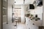 Tidlöst badrum med grå klinker på golvet och vitt kakel på väggarna. Utrustat med toalett, dusch, tvättställ och spegelskåp.