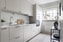 Vinkelformat kök med vita profilerade luckor, vitt väggkakel och bänkskiva av ljust trä. Samtliga vitvaror (induktionshäll, varmluftsugn, kyl, frys, diskmaskin och fläkt) är nya sedan förra året och kommer främst från märken som Siemens och Husqvarna. Köksdelen är öppen mot sällskapsdelen och erbjuder barsittning för två vid väggen som skiljer de två rummen.