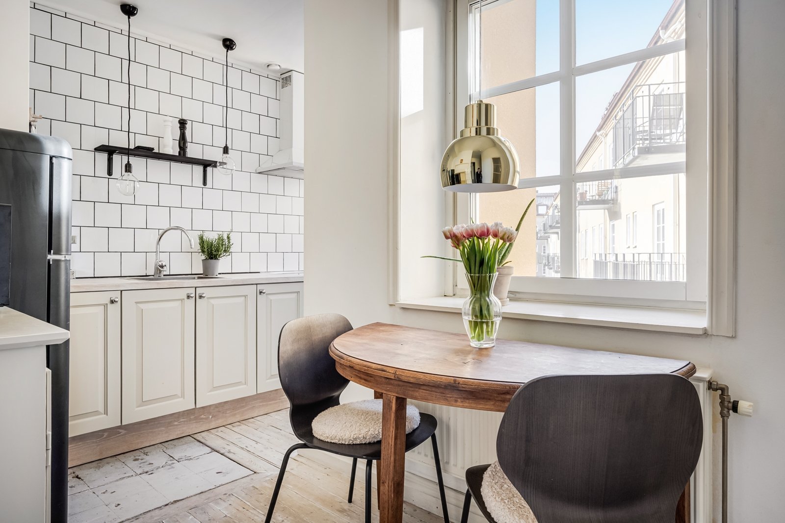 Köket från 2023 med härlig bistrokänsla är beläget mot den mysiga innergården. Två vackra fönster ger ett underbart ljusflöde och matplats bjuds för 3-4 personer. Köksinredningen i ljus sand möter vit kakel och bänkskiva av vitoljad, massiv ek. Känslan är ljus och luftig med gott om arbetsplats och förvaring. Ugn med spishäll, spisfläkt och kyl/frys fulländar känslan.