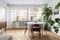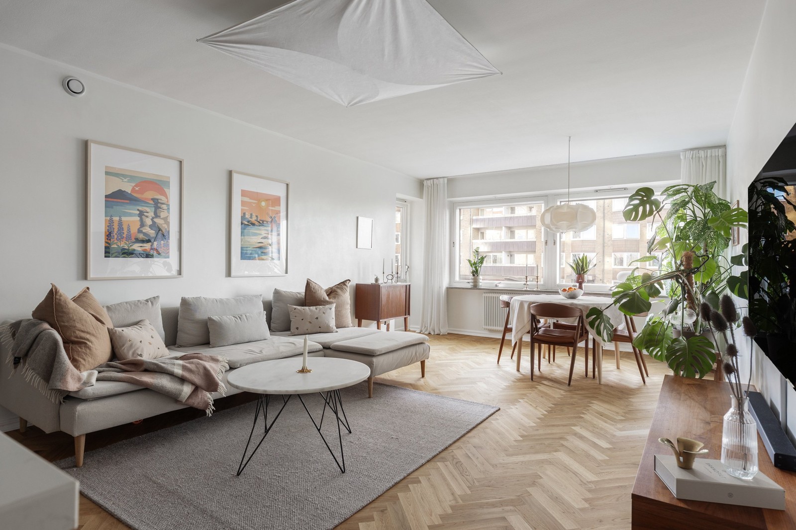 Kök och vardagsrum är förenade i en social och öppen planlösning. Den eleganta fiskbensparketten löper vidare genom rummet och möter ljusmålade väggar som skapar en luftig atmosfär. Köket är utrustat med induktionshäll, varmluftsugn, kolfilterfläkt, kyl och frys samt diskmaskin. Köksluckorna går i en ljusgrå ton och kombineras smakfullt med en vit bänkskiva i sten. En praktisk köksö erbjuder både förvaring och arbetsyta, samtidigt som den fungerar som en naturlig avgränsning mellan kök och vardagsrum.