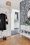Välkomnande hall med fiskbensparkett som möter vitmålade väggar och diskret tapetserade ytor. Här finns goda förvaringsmöjligheter genom praktisk skjutdörrsgarderob samt separat städskåp, vilket bidrar till ett ordnat och stilrent första intryck.