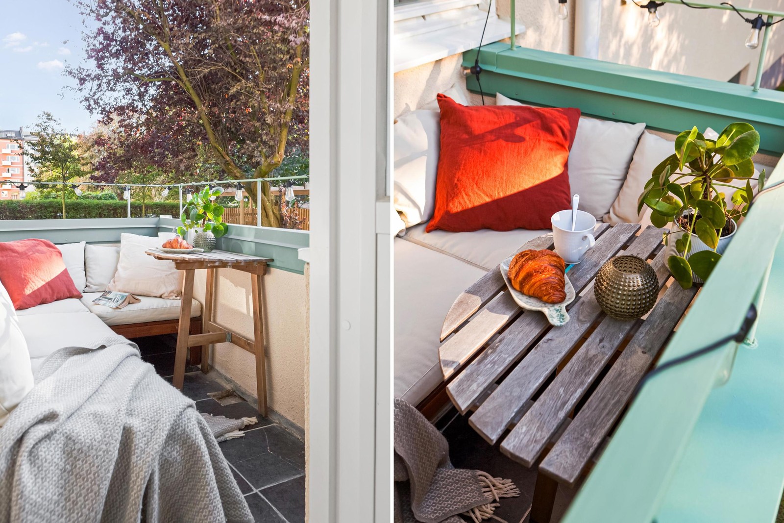 Balkongen i sydvästläge blir en naturlig förlängning av vardagsrummet. Här finns utrymme för loungesoffa och mindre bord. Idealisk plats att njuta av solen stora delar av dagen.