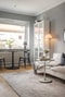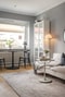 Rymligt rum med klassisk fiskbensparkett och gråa väggar. Rummet rymmer flertal möblemang och leder oss vidare in till köket.