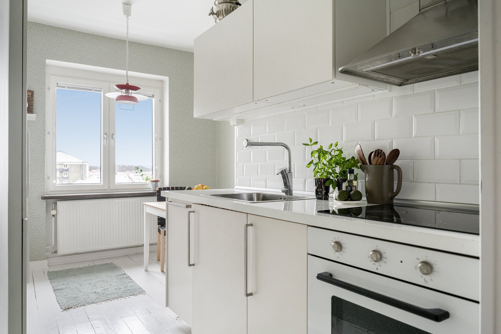 Mittemot entrén ligger bostadens trivsamma kök. Köksinredningen består av vita köksluckor och vitt kakel ovanför bänkskivan i vit laminat. Köket är utrustat med spishäll (Smeg), varmluftsugn (Smeg), diskmaskin (Ikea), kombinerad kyl/frys och köksfläkt. Matplatsen i köket rymmer upp till fyra personer. På golvet vilar ett vitmålat brädgolv och på väggarna sitter en snygg designtapet i Ribersborgsgröna toner.