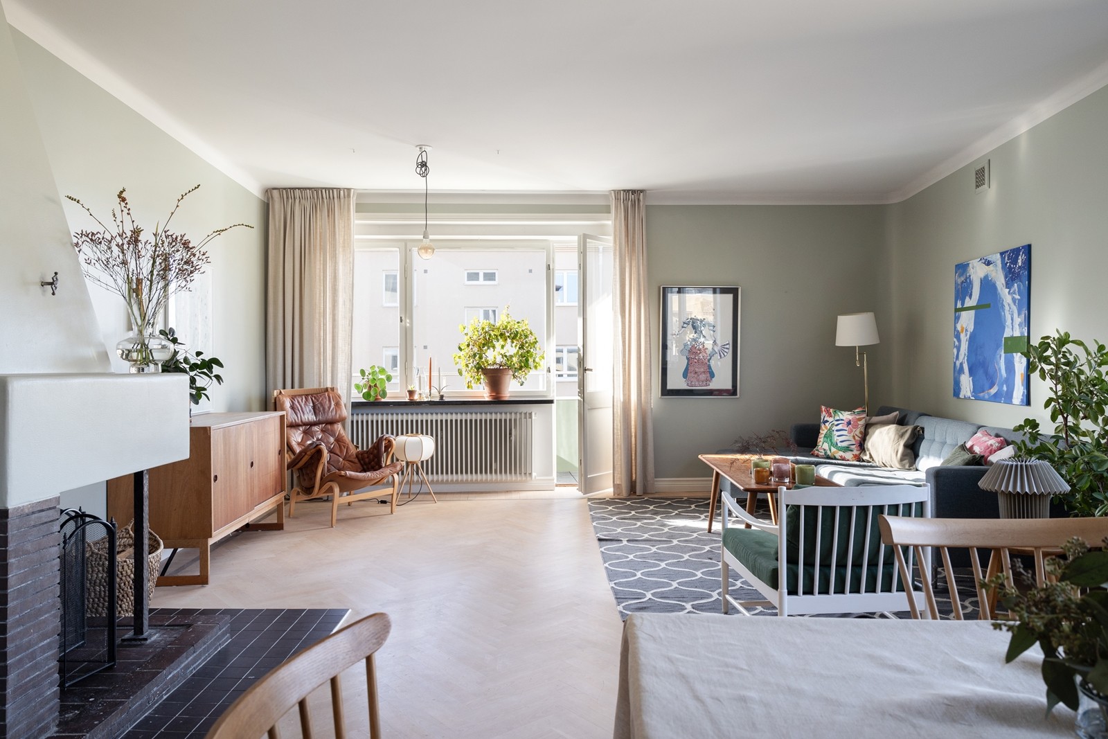 Vardagsrummet är en generös och ljus oas med vitbetsad fiskbensparkett, ljusgröna väggar och två stora fönsterpartier som släpper in härligt dagsljus. Den öppna spisen ger rummet en mysig och inbjudande känsla. Härifrån når du även lägenhetens balkong i västerläge – perfekt för soliga eftermiddagar och kvällar.