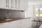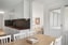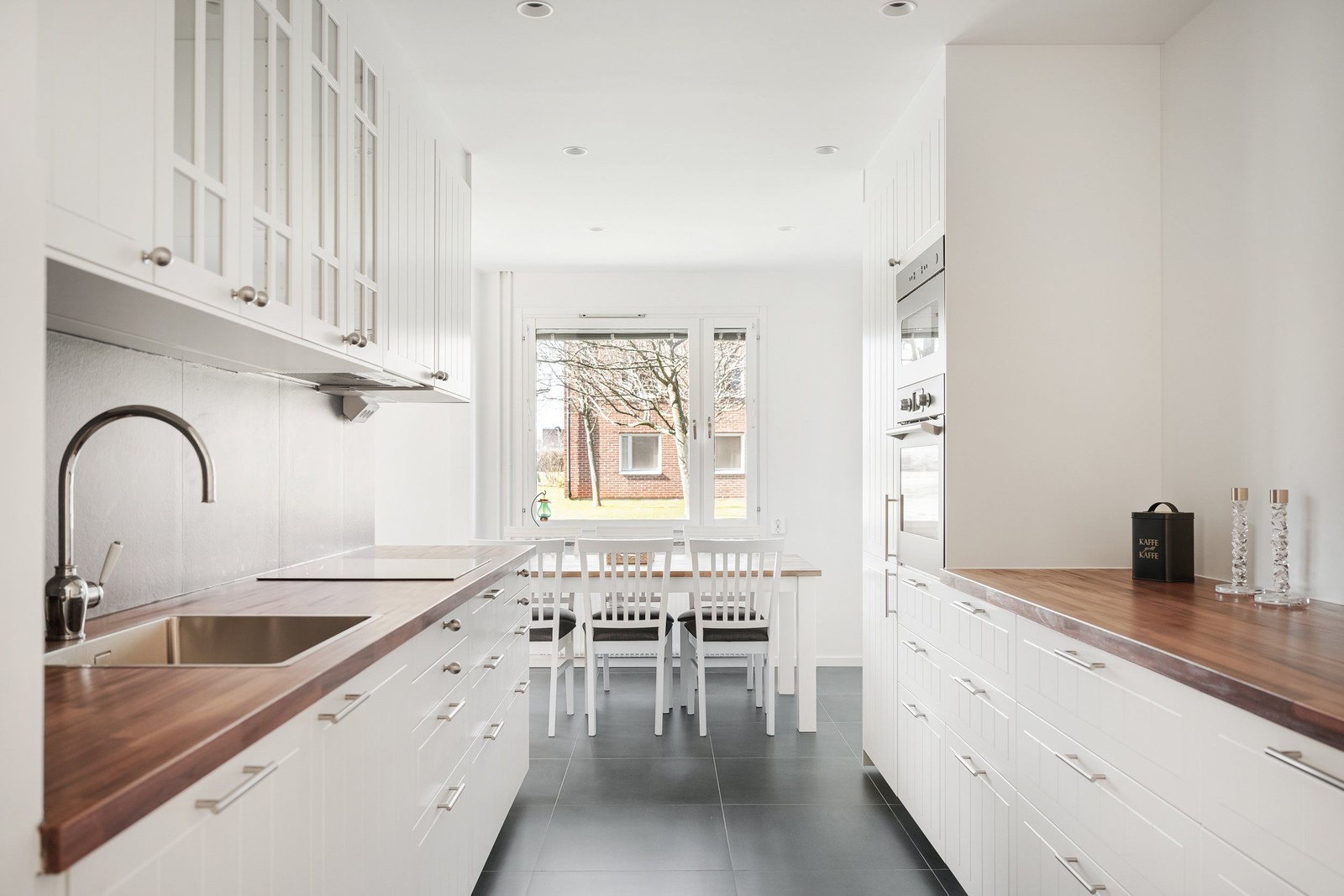 Stort och påkostat kök med vita luckor och stilrena materialval. Klinkergolv, vackra bänkskivor i trä samt infällda spotlights i taket. Köket är utrustat med spishäll, diskmaskin, kyl och frys samt ett elegant vitrinskåp med belysning. I anslutning finns en rymlig matplats som bjuder in till sociala middagar.