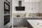 Modernt kök från Epoq med släta luckor i antracitgrå. Utrustat med två ugnar, induktonshäll, fläkt, underlimmad vask med blandare, kyl och frys. Ljusgråmålade väggar och fiskbensparkett.