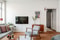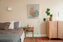 Från vänster i hallen når man vardagsrummet. Brädgolven pryder vardagsrummet tillsammans med ljusa väggar. Stora fönster med härligt ljusinsläpp. Här finns plats soffgrupp och och större säng. (sängen är idag 180 cm)