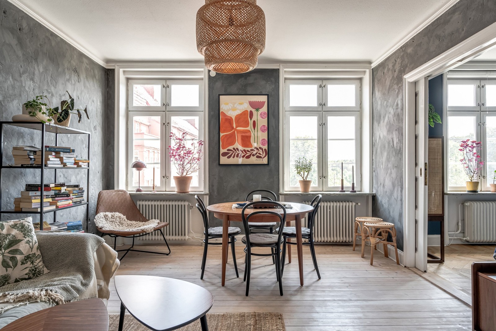 Bostadens hjärta utgörs av ett stort kök med rejäl matplats, smakfull köksinredning i modernt grått och fullutrustad maskinpark. Vidare in i lägenheten nås det sociala väl tilltagna vardagsrum med gott om plats för en större soffgrupp. Från hallen nås det halvkaklade badrummet som pryds av vitt kakel och marmor. Samtliga ytskikt är varsamt renoverade.
