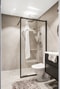 Badrummet är stilrent uppdaterat med grå mikrocement på både väggar och golv, vilket skapar ett modern känsla. Helhetsintrycket är tidlöst och elegant med en genomgående, sömlös finish. Badrummet är försett med regndusch, duschvägg, WC, tvättställ med kommod och badrumsskåp.